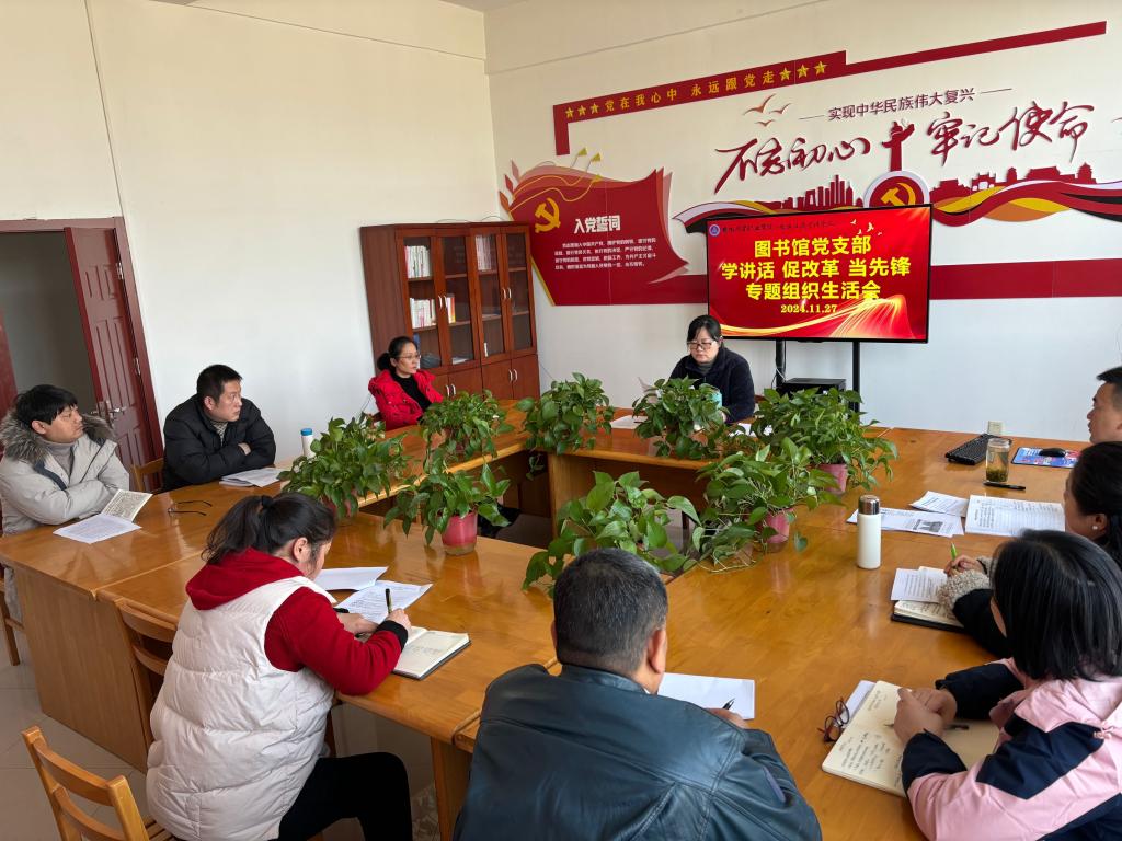 根据学院党委统一部署,11月27日下午,图书馆党支部在支部党员活动室组织召开“学讲话 促改革 当先锋”专题组织生活会,支部全体党员参加会议。