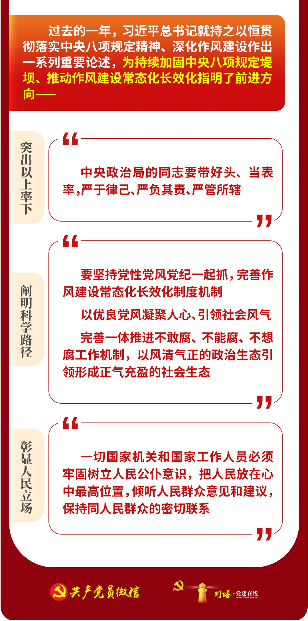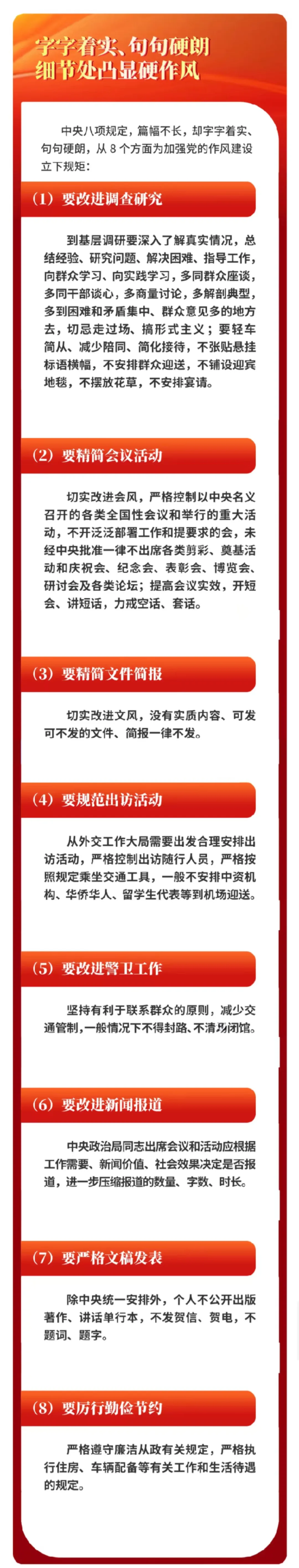 中央八项规定,短短600余字,涉及改进调查研究、精简会议活动等多方面。自出台以来,中央八项规定带来的党风政风社风民风变化,深刻影响和改变着中国,成为新时代中国共产党作风建设的“金色名片”。