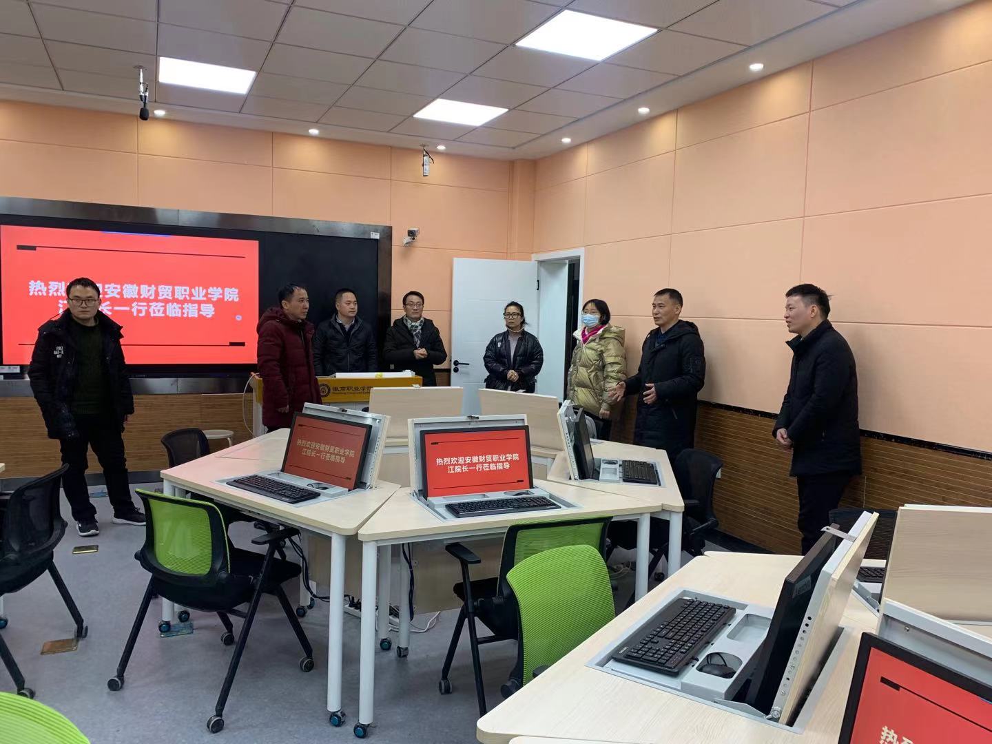 2021年1月11日上午,经济贸易学院副院长江友农、工商管理教研室主任王伟浩、电子商务教研室主任许明星等一行前往兄弟院校徽商职业学院商贸系进行考察交流。江友农一行受到了该校商贸系副主任褚先文、市场营销教研室主任蒋玉姣、汽车教研室主任贾屿等热情接待。双方就实训室建设、专业设置、人才培养方案制定等方面进行了深入交流。会后,褚先文副主任陪同我院教师参观了徽商职业学院营销实训室和定向扶贫直播实训室等。