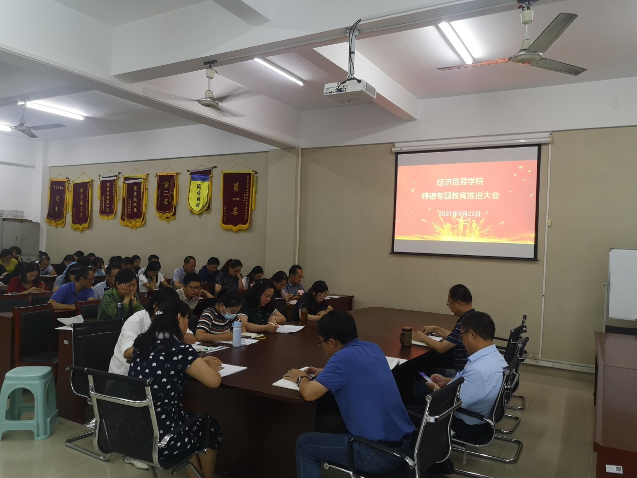 为热烈庆祝第37个教师节,将师德专题教育学习推向新的高潮,扎实推进党史学习教育走深走实,讲好经济贸易学院教师全面贯彻党的教育方针,爱党爱国、爱校爱生、无私奉献的奋进故事,激励全校师生崇德尚德、见贤思齐、接续奋斗,9月22日下午,经济贸易学院领导班子成员、全体教职工参加立德树人、师德教育推进会。学院党委书记陶云龙主持。