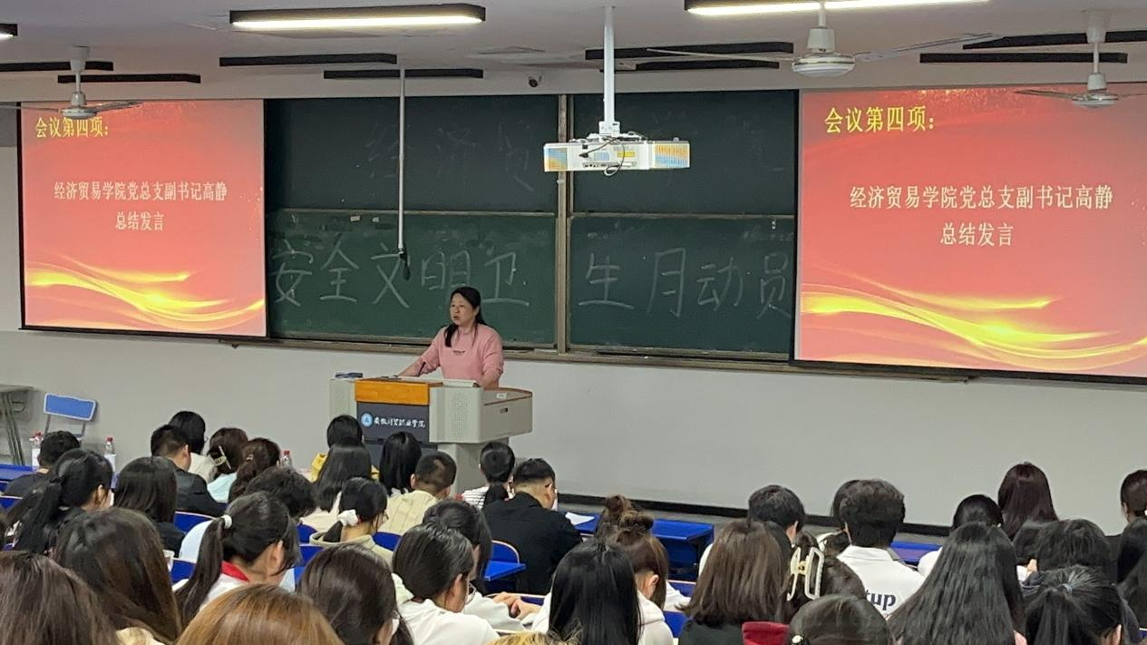 为切实加强学生行为规范教育,提升学生文明素养,增强安全防范意识,4月28日下午,经济贸易学院在6103教室开展安全卫生文明月动员大会。经济贸易学院党总支书记刘大俊、党总支副书记高静、学生处公寓管理中心主任王慧、全体专兼职辅导员以及2022级、2023级班长和寝室长参加了此次会议。