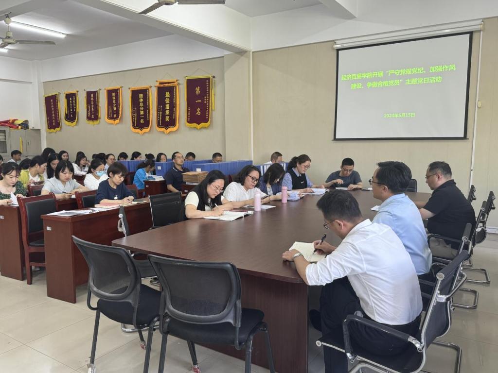 近日,经济贸易学院党总支在综合楼212党员活动室开展“严守党规党纪、加强作风建设、争做合格党员”主题党日活动,党总支书记刘大俊主持会议,全体党员教师参会。