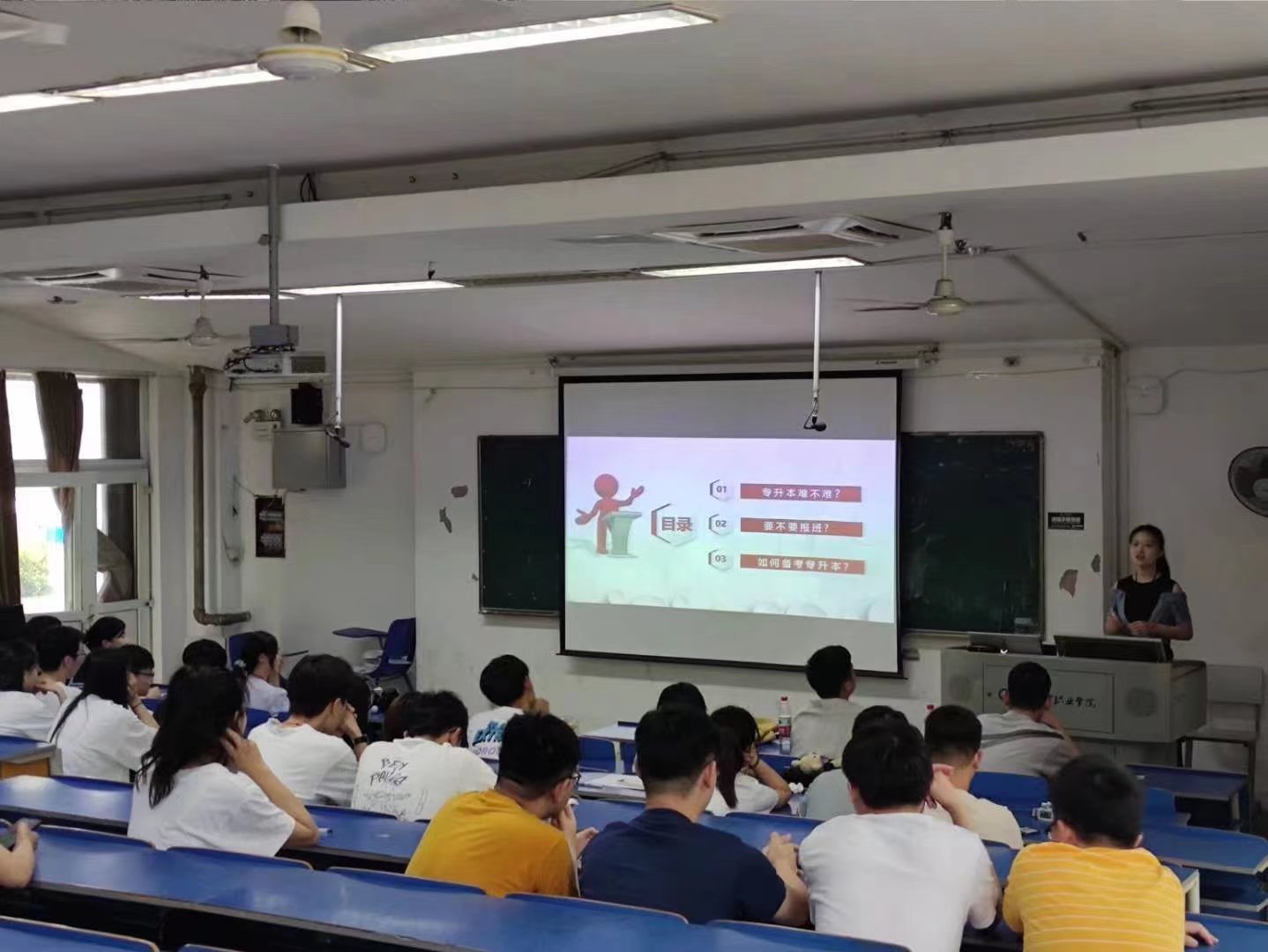 六位同学陆续发言,结合自己的备考经历,从专升本政策解读、专业选择、院校选择、公共课和专业课如何备考、应征入伍的优势等多角度,进行详细的讲解。他们言辞恳切,又不失幽默,活动现场氛围活跃,用心的分享,赢得了阵阵掌声。在场学生根据自身学习情况提出疑惑,并给予耐心的解答,并引导他们,要以一颗平常心积极应对专升本,合理调整生活学习作息,尽全力发挥自身取得潜力。