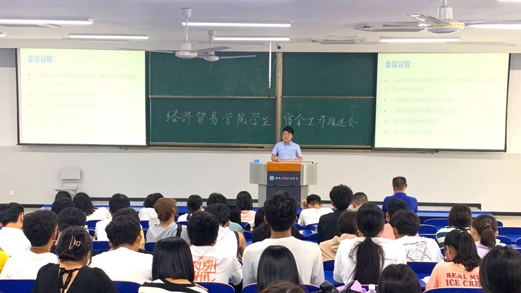 2021年9月28日,经济贸易学院顺利召开学生宿舍安全卫生工作推进大会。经济贸易学院党总支书记陶云龙、副书记丁蓉、团总支书记张超、新生辅导员莅临现场,全体团学干部和新生宿舍长参与会议。