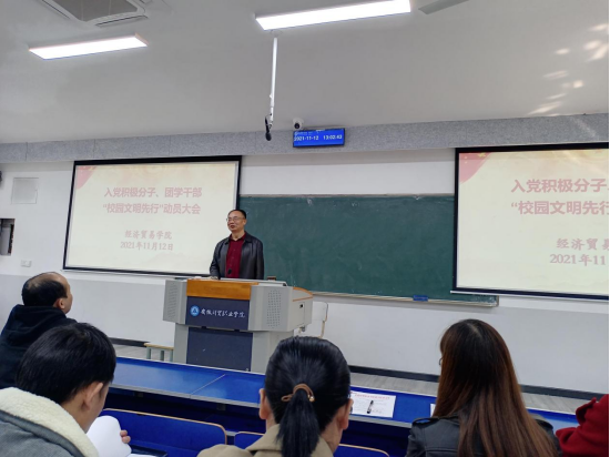 11月12日下午经济贸易学院在5201阶梯教室开展“校园文明先行“动员大会。经济贸易学院党总支书记陶云龙、副书记丁蓉、团总支书记张超、全体专职辅导员、入党积极分子和团学干部参与动员大会。学生干部代表韩莹莹和刘玉婷分别从党员和宿舍管理员的角度考虑为建设文明校园身体力行,以文明行为培养文明习惯,以个人文明带动集体文明。标兵宿舍代表丁汝佳表示作为标兵宿舍代表要争做带头作用,带动身边同学从小事做起,做到文明校园创建人人参与、人人尽责。禁烟学生代表关富贵同学详细地讲解了吸烟的危害,并对在校园内吸烟的行为做出了强烈批评,告诫大家远离香烟、珍爱生命。党总支书记陶云龙作总结发言,陶书记引经据典强调了做文明人、行文明事的重要性,举出福特就业、日本亚运会会场无垃圾的事例说明文明于人而言,小则改变命运,大则利于国家,并对与会者提出了建议与期望,希望大家严于律己,将文明谨记心间。会后,沈梦玲老师组织入党积极分子签订校园文明行为规范承诺书。
