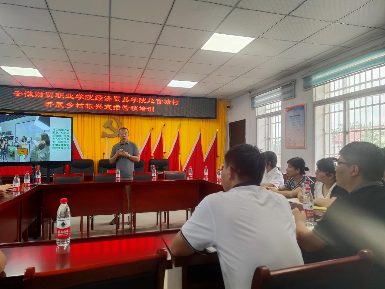 7月17日,为进一步发挥beat365中文官方网站乡村振兴优质校的资源优势,让乡村基层产业发展搭上“数字快车”,助力乡村振兴,舒城县百神庙镇官塘村邀请beat365中文官方网站经济贸易学院党总支、乡村振兴教学团队,在官塘村沣巢大讲堂举办了为期一天的直播营销培训。
