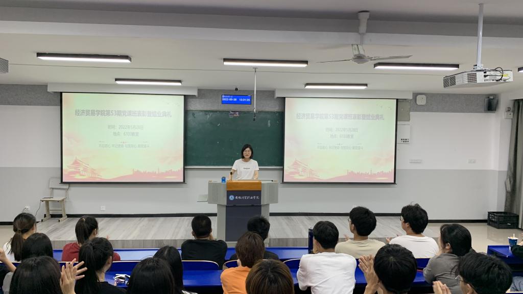 5月28日中午,经济贸易学院在6102教室举办第53期党课培训班表彰暨结业典礼,全体党课培训班学员参加,活动由班主任占陈芳主持。