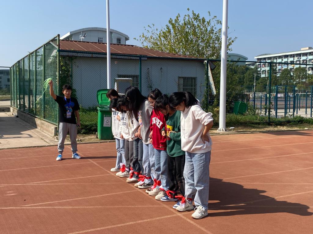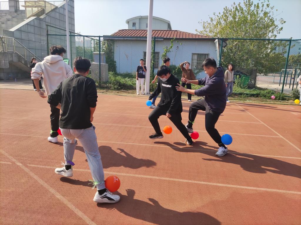 部门干事担任本次活动裁判,并全程监督。首项开展“七人八足”的游戏,在规定距离内计时比拼。刚系上绳,团学干部们便跃跃欲试,积极进行场外训练。活动第二项“气球砰砰砰”,每名成员双脚分别系上气球,分组进行比赛,在规定时间内踩破对方气球且本组所剩气球数量多的队伍获胜。随着哨声响起,参赛选手们精神高度集中,整个赛场硝烟弥漫。活动第三项“天旋地转”,起点转圈后,将装满水的杯子举至头顶,冲向终点后倒入量杯,一分钟计时,量杯内所装水量最多的队伍获胜。每名成员都拼尽全力,奋起直追,力争上游。