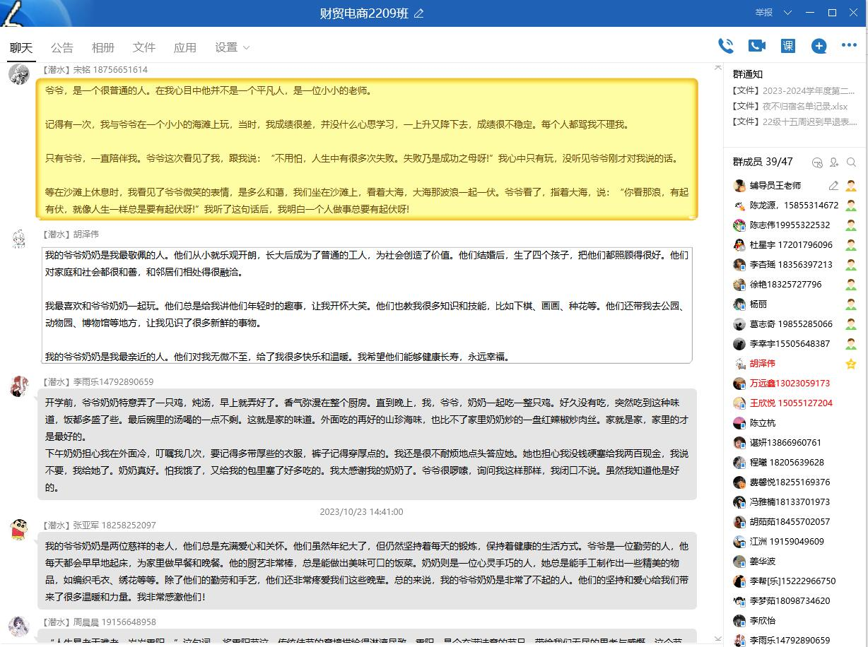 10月23日重阳节当天,经济贸易学院电商2209班团支部在线号召全班同学开展了以“了不起的爷爷奶奶”为主题,写一篇回忆性小短文,让同学们依次发表了对自己爷爷奶奶之间的情感。活动在班级群发出后,班级同学积极响应,同学们纷纷表示,孝敬长辈要从自我做起,从小事做起,用实际行动促进家庭幸福和社会和谐。