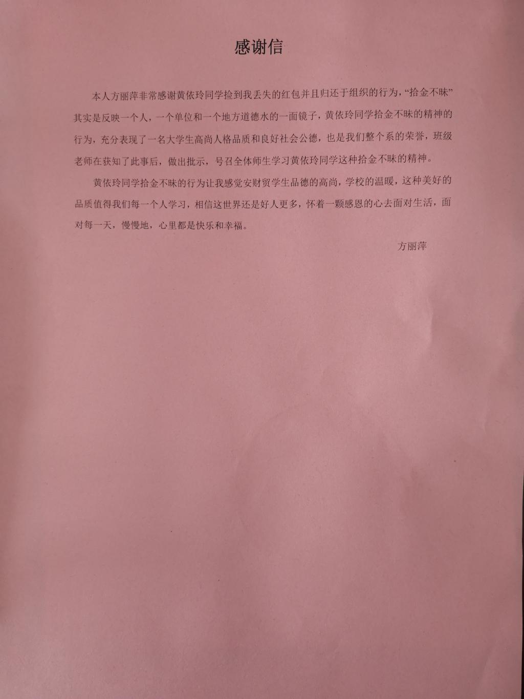 2021年1月期末考试期间,经济贸易学院工商2002班黄依玲同学在四号公寓前的校园小路上捡到一个红包,内有现金1500元。由于大部分同学已经放假,她在原地站了一天都没有等到失主,于是将现金主动交给辅导员老师。新学期开学后,通过校团委宣传扩散寻物启事,失主最终被找到。