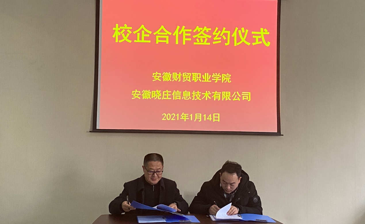 1月14日下午,经济贸易学院与安徽晓庄信息技术有限公司校企合作签约仪式在综合楼212会议室举行。上海晓庄教育信息咨询有限公司总经理肖学彪、安徽晓庄信息技术有限公司总经理席东升、技术总监程达量,教务处副处长钟晓鹏、经济贸易学院院长黄诗义、副院长曹宝亚等出席签约仪式,副院长江友农主持签约仪式。