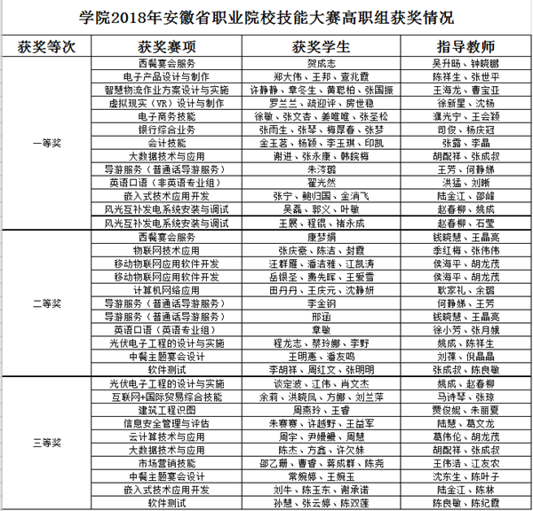 日前,由省教育厅、省经济和信息化委员会、省人力资源和社会保障厅共同举办的2018年安徽省职业院校技能大赛落下帷幕。经专家评判和网上公示,高职组共评出197个一等奖,365个二等奖和527个三等奖。我校选手不负众望,载誉而归,荣获一等奖13项,二等奖11项,三等奖10项,荣获高职组团体总分第六名及“高职组优秀组织奖”。 职教成就梦想,技能点亮人生。多年来,学校坚持以就业为导向,以质量为生命,狠抓人才培养质量,大力推进教育教学改革,不断深化校企融合、工学结合。学校高度重视技能大赛工作,校领导多次召开专题会议,亲自到现场观摩指导;各学院、相关部门积极协调,相互配合,扎实做好大赛服务工作;全体指导老师认真总结大赛经验,积极备战,悉心指导;参赛选手团结拼搏,刻苦训练,最终取得了喜人成绩。