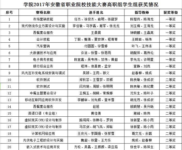 今年,学院7个二级学院分别组队参加了2017年全国职业院校技能大赛、安徽省职业院校技能大赛,34支参赛队伍获奖,其中,6项入围国赛并获奖,为学院历年参赛的最好成绩,全面彰显了学院近年来的办学特色和育人成果。6月14日,由教务处组织,学院举办了2017年职业院校技能大赛分享活动。