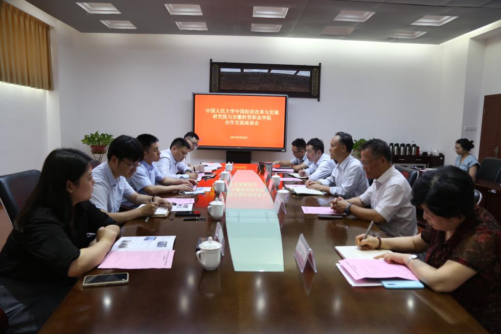 6月29日下午,中国人民大学中国经济改革与发展研究院培训部主任付申一行来校交流。学校党委书记张志祥、办公室、组织人事处、教务处相关部门负责人参加合作交流座谈会,会议由学校党委副书记、校长刘银国主持。