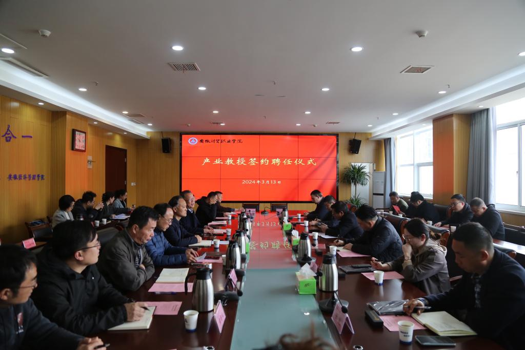 会上宣读了《安徽省教育厅 安徽省人力资源和社会保障厅关于公布2023年安徽省产业教授名单的通知》,聘任北京融智国创科技有限公司创始人刘温泉,新道科技股份有限公司首席专家梁峰,中外运物流华中有限公司原董事长、法人代表周保昌,苏州德创测控科技有限公司总经理葛大伟,安徽花希谷托育服务有限公司联合创始人郭元媛和安徽省旅游规划设计研究院院长助理张凯为学院首批产业教授。校方与产业教授逐一签约并发放聘书。