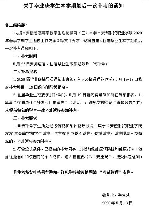 2020年毕业班学生最后一次补考安排