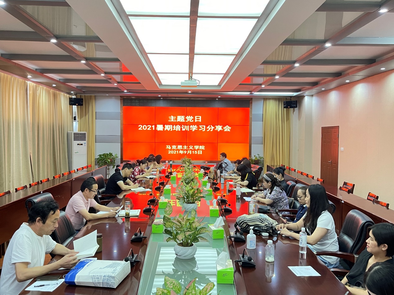 9月15日下午,马克思主义学院党支部在行政楼第四会议室举办了“2021暑期培训学习分享会”。马克思主义学院院长、党支部书记王良斌主持会议,组织人事处副处长张少兵作为行政兼教老师列席会议,支部全体党员参加了会议。