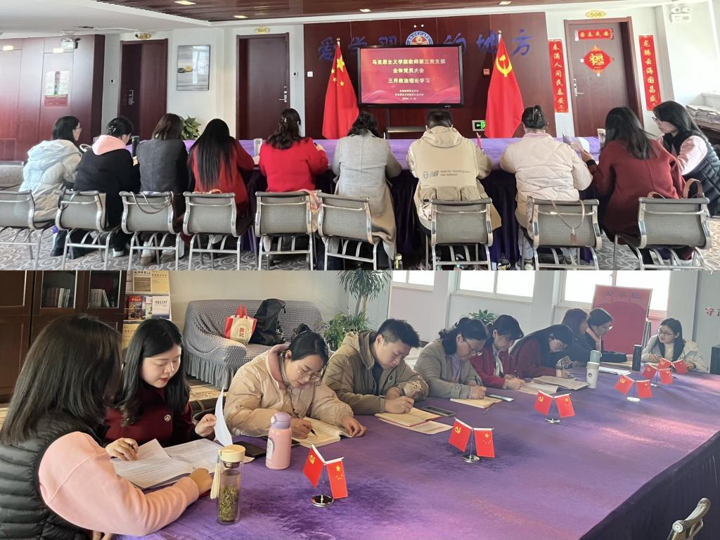 3月20日下午,马克思主义学院教师第三党支部在行政楼五楼会议室召开三月政治理论学习会,全体党员教师参与,支部书记徐明主持会议。