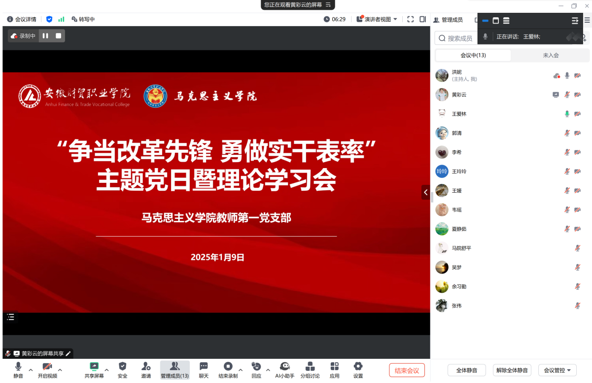 1月9日晚,马克思主义学院教师第一党支部召开“争当改革先锋 勇做实干表率”主题党日暨理论学习会。