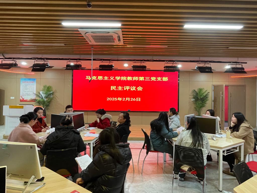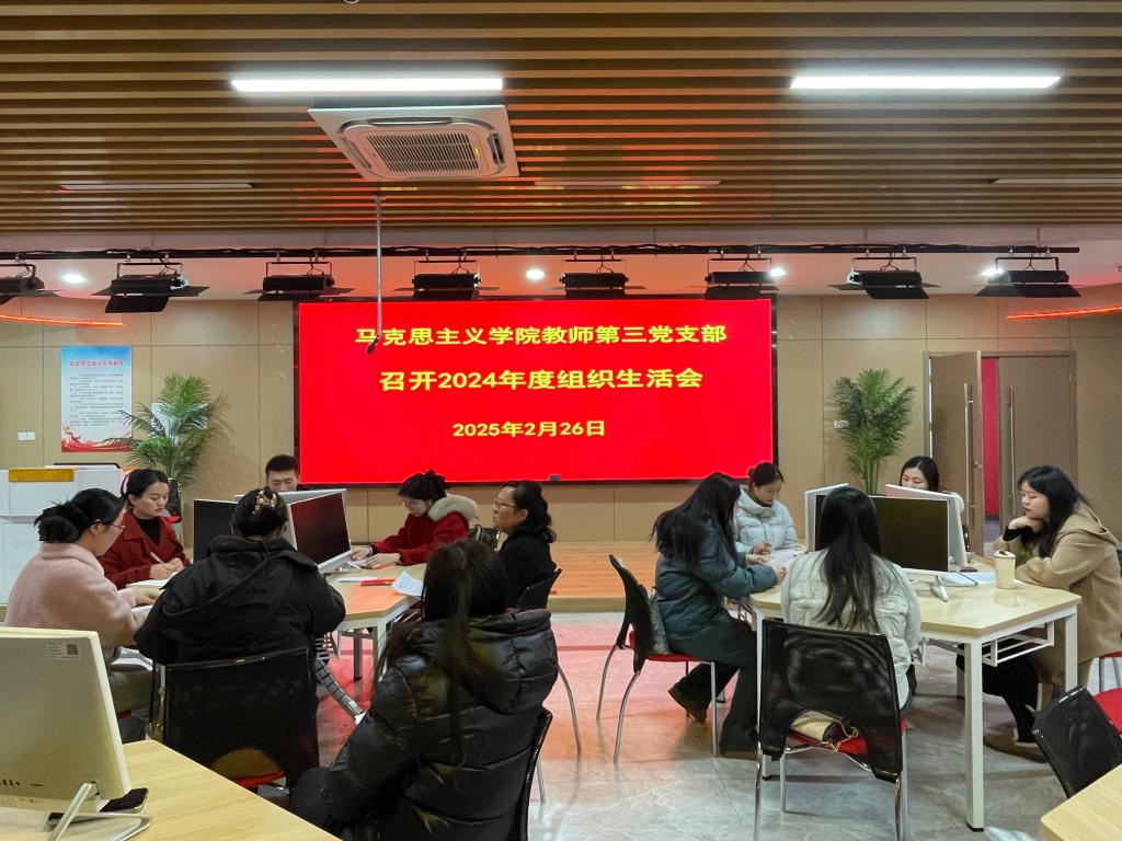 2月26日,马克思主义学院教师第三党支部召开2024年度基层党组织生活会暨民主评议党员大会,回顾2024年度支部工作,开展批评与自我批评,深入开展剖析与民主测评。