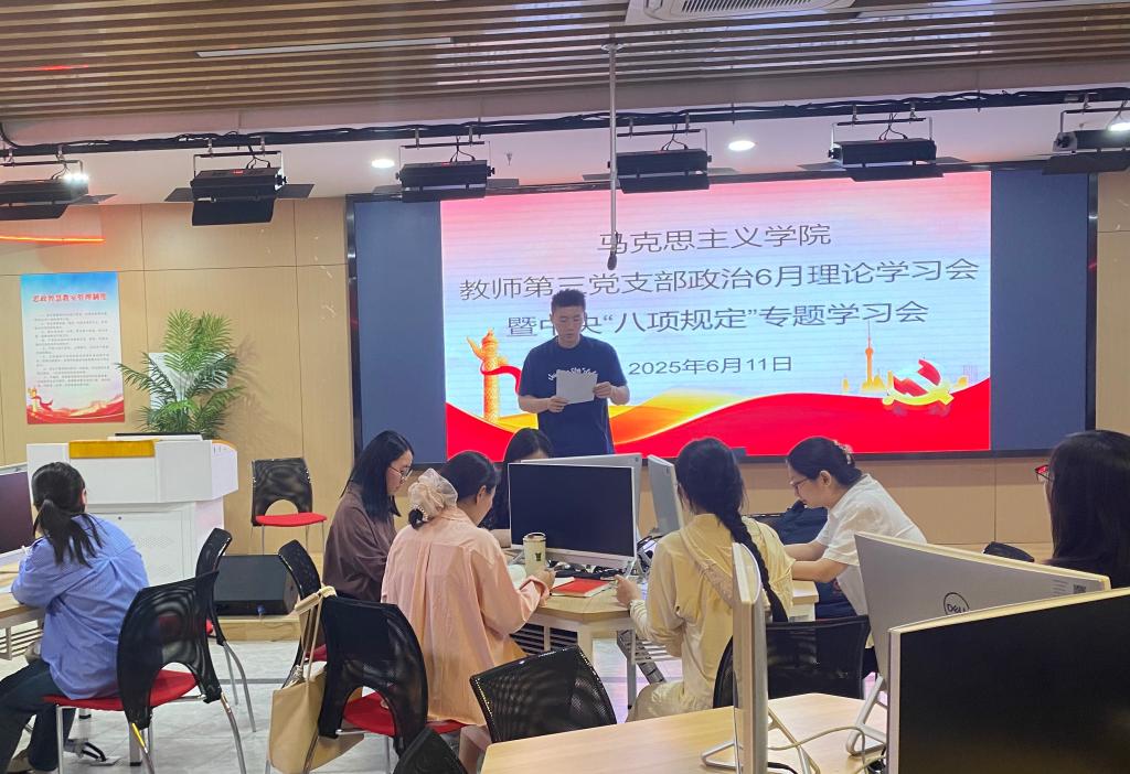 6月11日,马克思主义学院教师第三党支部召开六月政治理论学习会,专题深入贯彻中央八项规定精神。会议由党支部书记徐明主持,全体党员参加。