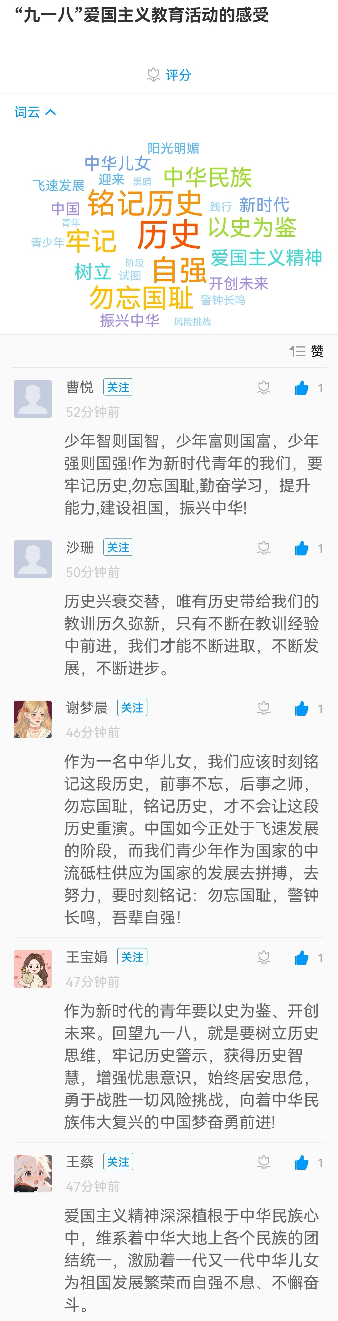 “九一八”爱国主义主题教育活动,这一段血和火的历史,激发了青年学子的爱国共鸣,感受到今天的和平来之不易。同学们纷纷表示,一定不忘历史,继承先烈遗志,奋发图强,保卫祖国,守护和平。