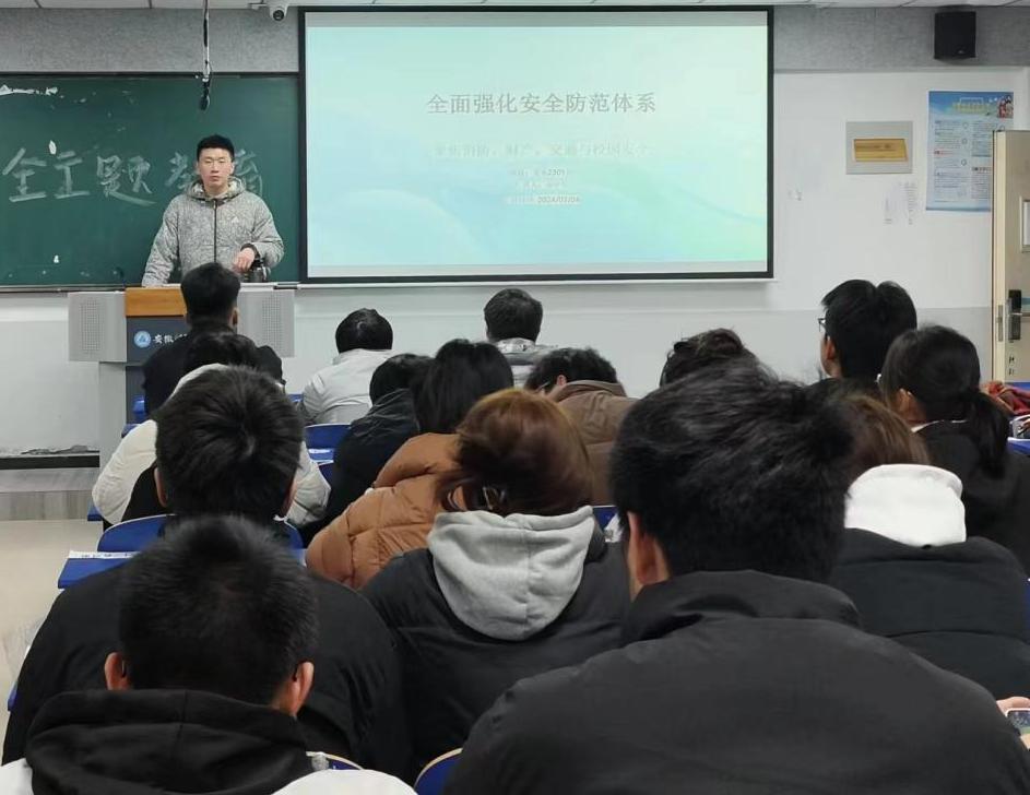 会议围绕消防安全基础知识、财产安全防范措施、交通安全规则要点、校园安全预防策略四个方面,结合大学生容易发生的安全事故,以案说法,对学生进行安全主题教育,传达学校构建“安全校园”“无烟校园”的各项要求,构建文明安全校园。