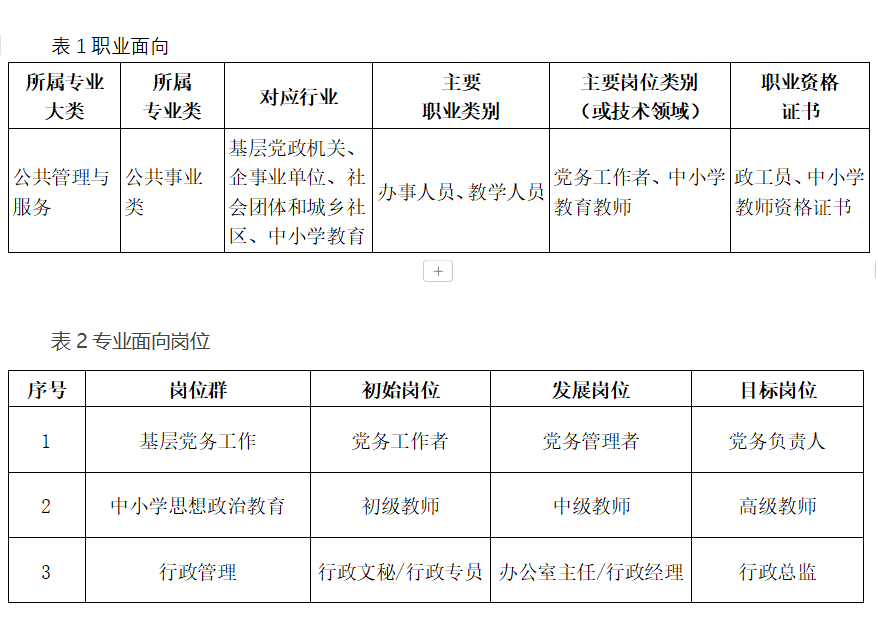 培养能在基层党政机关、企事业单位、社会团体和城乡社区从事党务宣传与管理工作、思想政治工作、行政管理工作等的高素质应用型人才。本专业要求学生通过三年的系统学习,在政治素养、道德品质、业务知识等方面达到国家规定的全日制专科毕业水平,具备从事基层党务工作、思想政治工作、行政管理工作的基本能力。