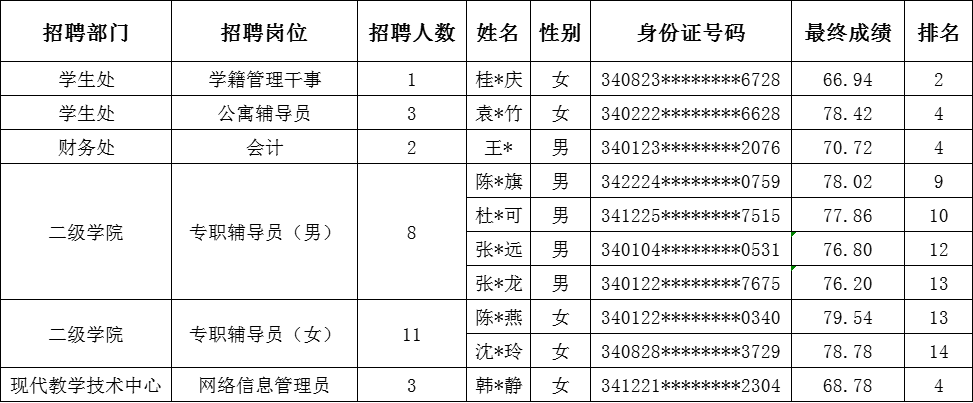 在2021年度学院公开招聘聘用制人员资格复审阶段,因考生放弃资格复审或资格复审不合格等原因,学籍管理干事(201223)、公寓辅导员(201224)、会计(201225)、专职辅导员(男)(201228)、专职辅导员(女)(201229)、网络信息管理员(201233)等6个岗位共缺额10人。