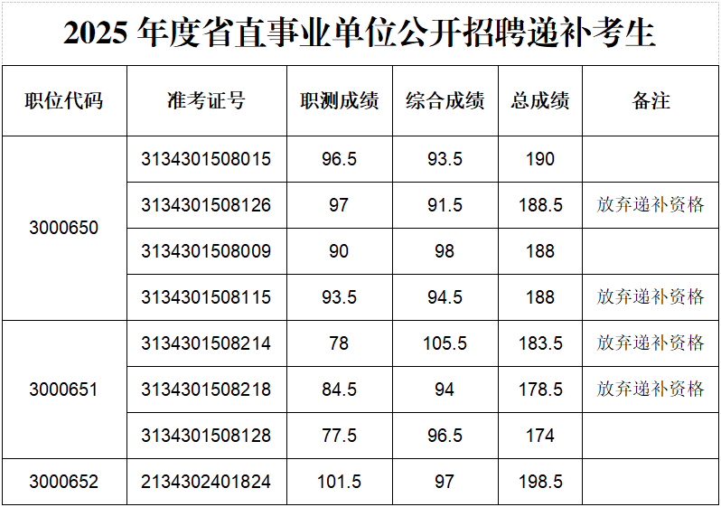 根据《beat365中文官方网站2025年度省直事业单位公开招聘工作人员进入资格复审人员的通知》,3000650、3000651和3000652岗位因考生资格复审不通过或放弃资格复审等原因出现人选缺额,现按照笔试成绩从高分到低分,依次等额递补(笔试成绩须达到最低控制合格分数线,并且每科成绩不低于60分),最后一名如有数名考生笔试成绩相同,一并进入资格复审环节。