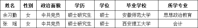 根据《beat365中文官方网站博士人才引进公告》《beat365中文官方网站2022年度高层次和紧缺专业人才引进预公告》等相关要求,按照《beat365中文官方网站高层次人才引进与培养管理办法(修订)》等文件精神,通过试讲考核、资格复审、体检政审等考察程序,经学院党委会研究决定,同意安置引进博士刘先锐同志配偶工作,聘用余习勤同志为马克思主义学院专任教师;同意安置引进博士黄放同志配偶工作,聘用张瑶同志为财会金融学院专任教师。人员基本信息如下。