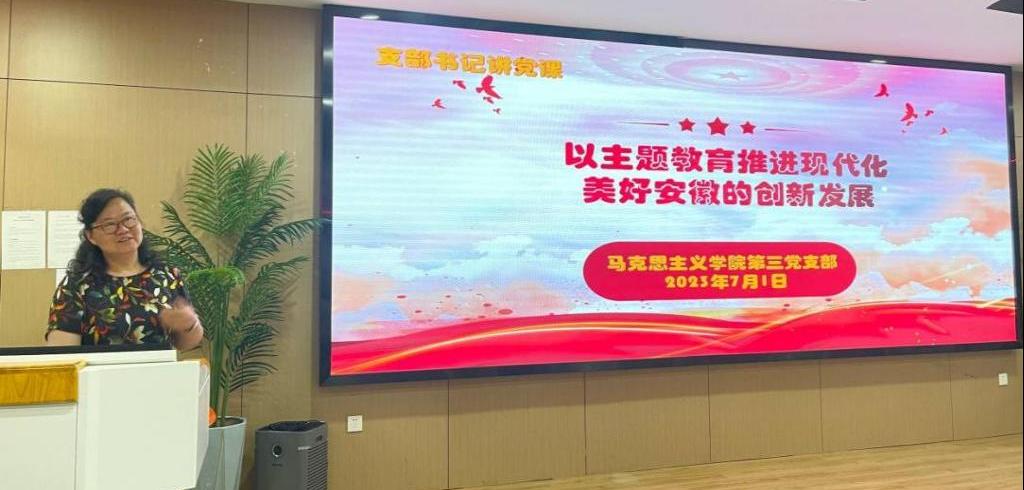 7月1日,马克思主义学院党总支在思政智慧教室开展“支部书记讲党课”,总支青年委员、教师第三党支部书记徐明作《以主题教育推进现代化美好安徽的创新发展》专题党课。马克思主义学院全体教师党员参加。