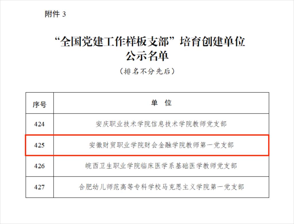 3月18日,教育部公布《教育部思想政治工作司关于第四批新时代高校党建示范创建和质量创优工作遴选结果的公示》,遴选产生了10个全国党建工作示范高校、100个全国党建工作标杆院系、1001个全国党建工作样板支部。学校财会金融学院教师第一党支部入选“全国党建工作样板支部”培育创建单位。