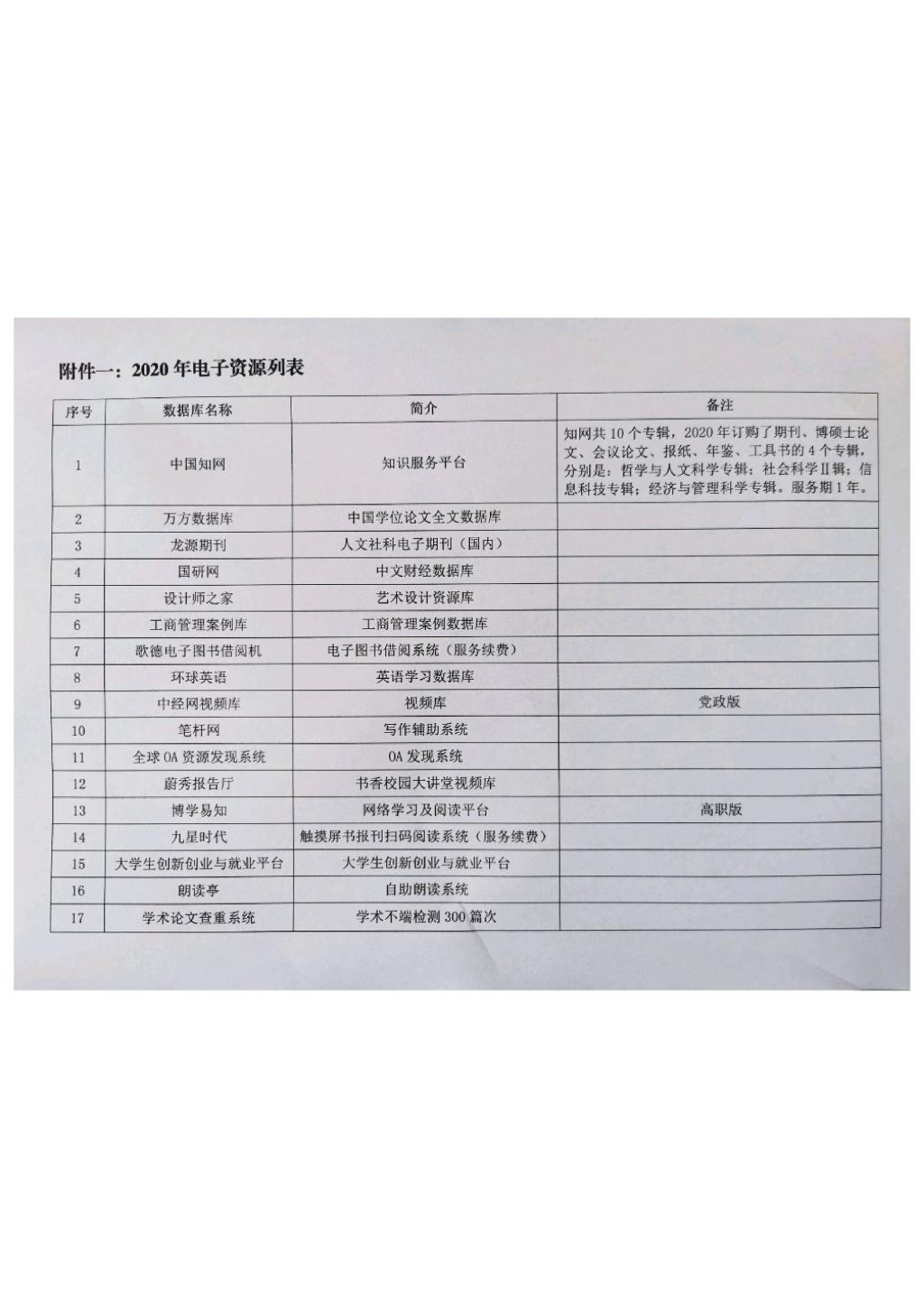 电子资源建设是学校人才培养和学科建设的重要支撑和保障,在学校教育事业发展中发挥了越来越重要的作用。为提高2021年电子资源采购预算经费使用效益,切实增强电子资源采购的针对性和适用性,图书馆现启动2021年电子资源建设项目征集工作,在全校范围内征求各单位对2021年图书馆电子资源订购的需求和建议。图书馆现将2020年的电子资源列表(附件1)发送至各单位,以供参考。
