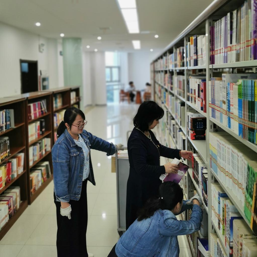 在三楼文艺书库,全体党员同志有序分工,先将在架的乱序图书下架,再按中图分类法的正确顺序重新上架,提高了图书摆放顺序的准确性,方便读者准确快速找到想要借阅的图书,保证图书馆随时为读者提供高效优质的服务。由于今年书库装修和扩充调整,原有和新增书库的排序、倒架、新书上架任务都十分繁重,王永平率领全体党员,从暑假前开始,数次协助书库开展图书整理、排序、上架、倒架的活动,是共产党员在图书馆攻坚克难工作中发挥先锋模范作用的重要体现,增强了党支部的凝聚力、战斗力和向心力,推动了党史学习教育内化于心、外化于行,引导广大党员干部在实践活动中学党史、担使命、践初心、办实事。