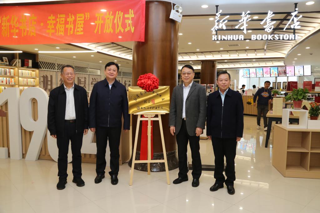 仪式上,郭志学、郑圣辉、魏邦余、刘银国为“新华书店·幸福书屋”揭牌。