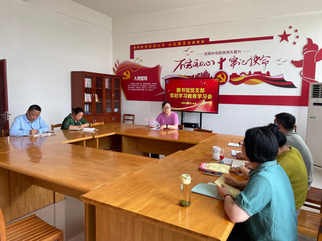 为进一步强化纪律教育,促进党员干部增强纪律意识,根据《beat365中文官方网站党纪学习教育工作方案》要求,结合图书馆党支部党纪学习教育学习计划安排,6月18日下午,图书馆党支部在党员活动室召开了严守“六大纪律”筑牢思想根基专题学习会。