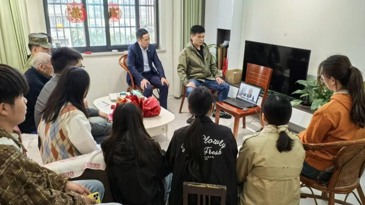 肥西县军休所所长张世松为大家介绍了彭克周老前辈的英雄事迹。肥西县退役军人事务局工作人员组织大家观看彭老前辈的采访视频。同学们与彭克周老前辈促膝交谈,一起回忆当年的峥嵘岁月,认真聆听他述说抗美援朝的英勇事迹。彭老前辈听力减退,同学们用纸笔写下了对老前辈的感激与祝福。