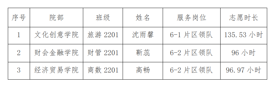 12月12日-26日,我校选派了90名青年志愿者参加第十四届中国(合肥)国际园林博览会志愿服务工作,事后,团市委对我校志愿服务工作给予了高度评价,并同意按照总人数的3%予以“优秀志愿者”表彰。根据实际工作安排情况,各大片区的领队共计3名同学接受表彰。现将名单公示如下:
