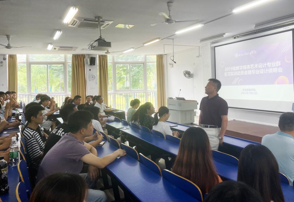 7月23日中午,文化创意学院召开了数字媒体艺术设计专业群顶岗实习动员会。学院党总支书记张克、院长郭湘如,相关指导老师、辅导员和2019级数字媒体艺术设计专业群全体学生参加了此次会议。会议由教研室主任胡杨主持。