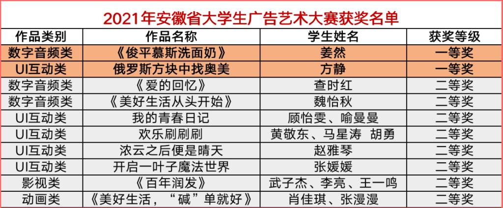 近日,2021年第十三届安徽省大学生广告艺术大赛(教育厅B类赛事)成绩揭晓,文化创意学院数字媒体艺术设计专业群师生喜获2个一等奖、8个二等奖、18个三等奖,突破历史最好成绩,部分获奖作品将参加国赛总评审。