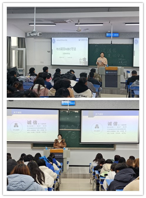 在班会中,辅导员从“考试诚信与遵纪守法”的角度,真正引导学生“守法律,讲诚信”。考试作弊不仅会践踏诚信理念,加剧信用危机,也会助长部分学生不劳而获、投机取巧的心理,干扰良好学风的形成,严重阻碍个人的健康发展。对于即将到来的期末考试,各班签订了诚信考试承诺书,并进行了诚信宣誓。