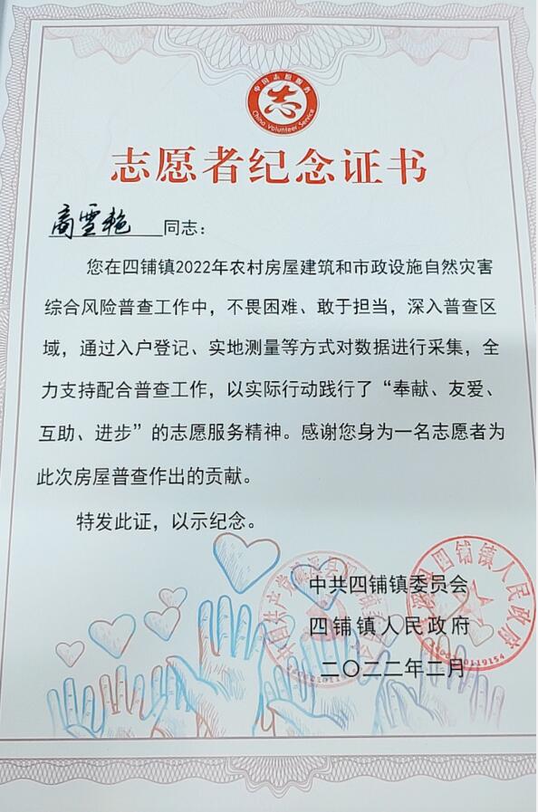 文化创意学院环艺2001班商雪艳同学,在寒假期间,积极响应党和政府的号召,不畏艰难、敢于担当,深入家乡的建设服务当中,积极投身于四铺镇2022年农村房屋建筑和市政设施自然灾害综合风险普查工作一线。整个寒假四十多天,商雪艳同学通过入户登记,实地测量等方式对数据进行采集,全力支持配合普查工作,以实际行动践行了“奉献、友爱、互助、进步”的志愿服务精神。