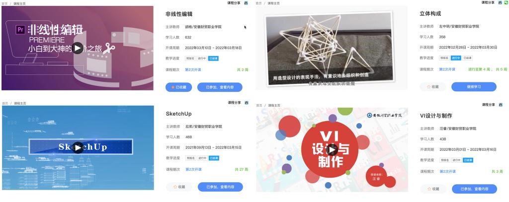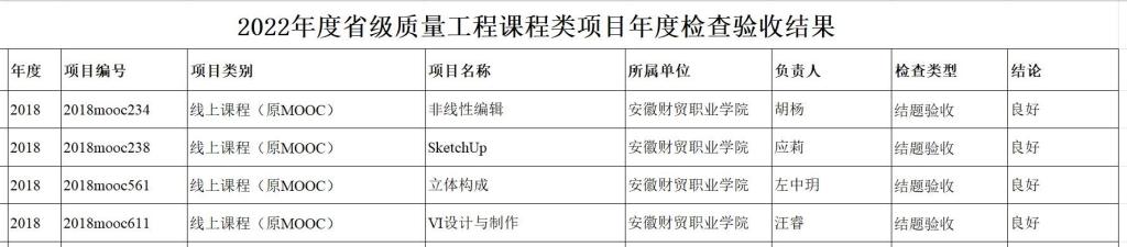 近年来,为促进专业课程建设,响应学院加强专业群建设的号召,发挥高校社会服务重要职能,文化创意学院数字媒体艺术专业群建设并上线运行大规模在线开放课程,课程涵盖了专业群内广告艺术设计、动漫设计、环境艺术设计等三个专业。其中,由胡杨团队主讲的《非线性编辑——小白到大神的进阶之旅》应莉团队主讲的《SketchUp》左中玥团队主讲的《立体构成》汪睿团队主讲的《VI设计与制作》第一批课程作为省级质量工程立项建设项目,于2022年顺利通过项目检查验收,均以“良好”结项。