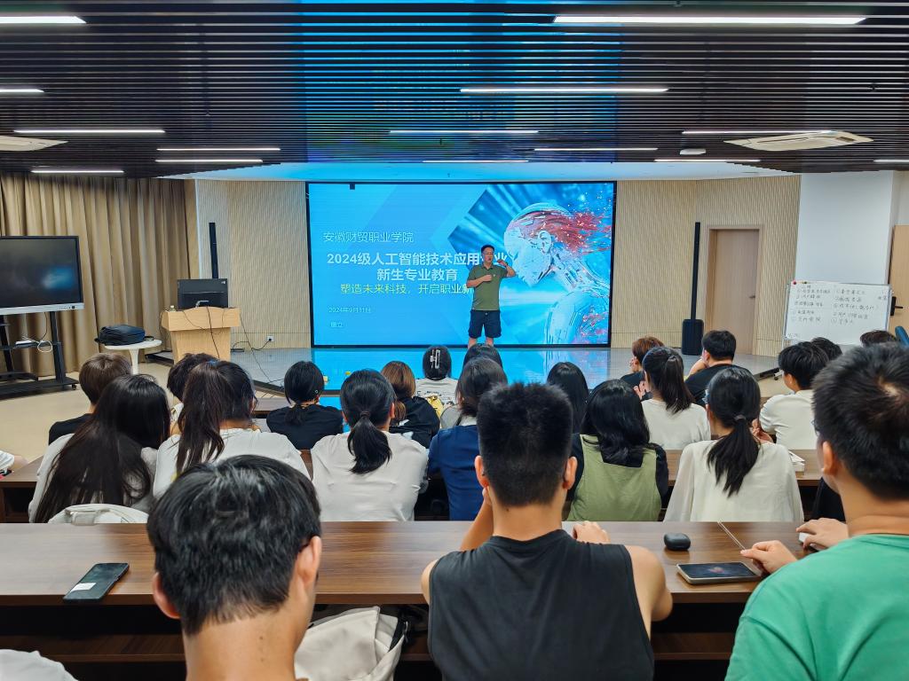 9月11日晚,未来技术学院人工智能技术应用教研室在第二实训大楼A1203开展新生专业教育。教研室主任唐立担任主讲,合肥争渡网络科技有限公司总经理凌树生受邀出席讲座,人工智能技术应用专业2024级全体学生参加活动。