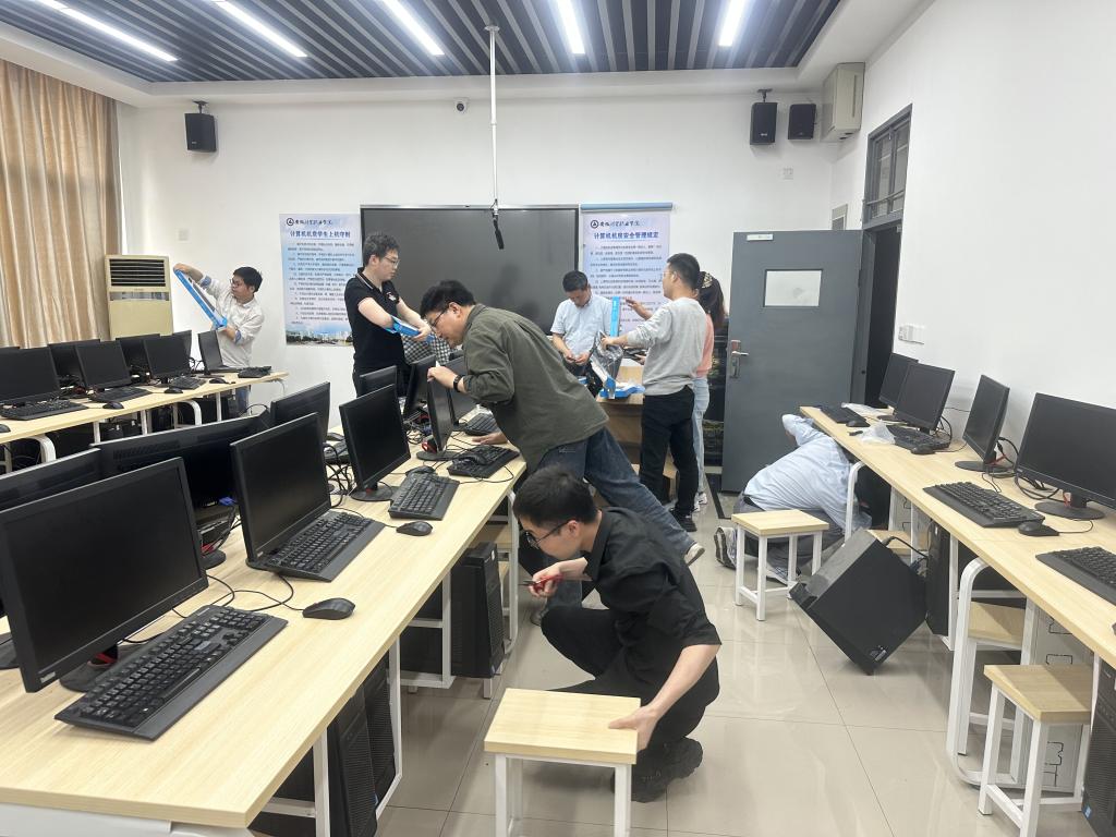 全体党员同志和积极分子在9号实训楼党建办公室集合,党支部书记吴晓光安排部署本次工作任务,对3个实训机房的老旧键盘和鼠标进行全面更换。党员同志们逐个拆卸计算机设备,基于工作内容的特殊性以及工作量的艰巨性,大家采取流水作业的方式,明确工作任务,你拆箱我拆线他捆扎,你安装我调试他清洁。设备更换工作完毕之后,党员同志们开始对设备进行清洁和擦拭,连键盘中间的小缝隙都不放过,认真且高效地完成清洁工作,整个实训机房焕然一新。大家撸起袖子一起干,挥汗如雨,欢声笑语,其乐融融,累并快乐着。