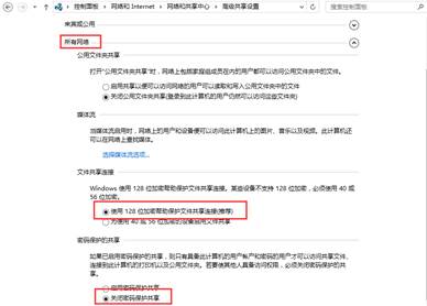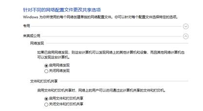 1、 打开控制面板->网络和共享中心,左上角单击【更改高级共享设置】,将专用、来宾和公用选项下面的“启用网络发现”和“启用文件和打印机共享”勾选上,如图4所示。