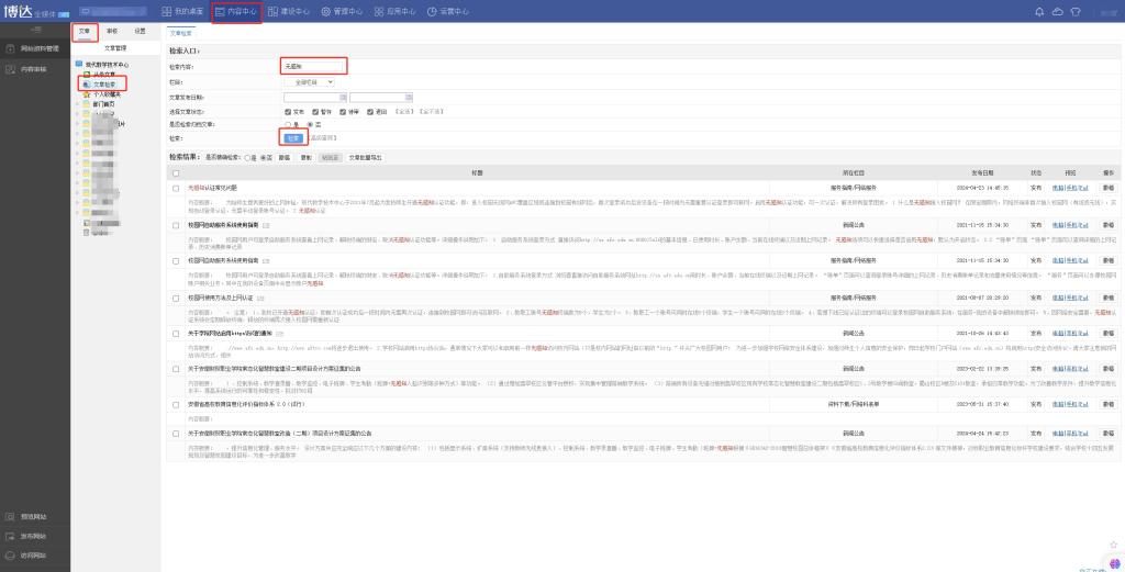 在内容中心一文章一文章检索一检索内容中输入关键字,点击检索,即可看到检索结果,如图1所示。