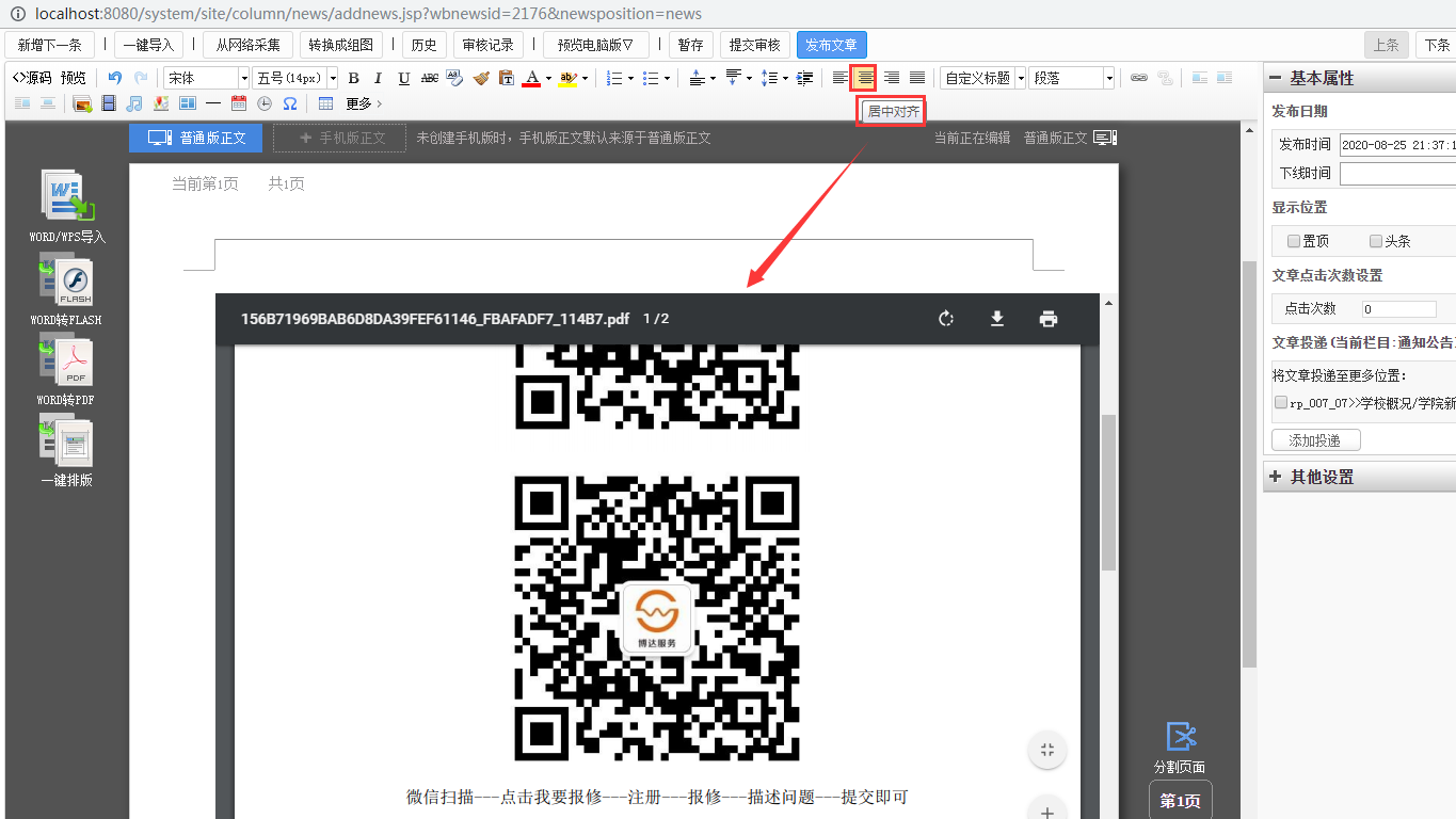在文章编辑器中插入PDF后,点到PDF上点击上方编辑工具中的居中,如图1所示。