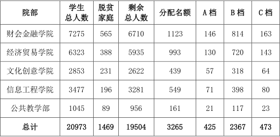 省财政厅、省教育厅分配我院2021-2022学年度国家助学金名额4957人。因社会扩招学生尚未报到,参考往年报到比例,预留社会扩招学生国家助学金名额223人,本次实际分配在校生国家助学金名额4734人。其中,脱贫家庭学生(原建档立卡)1469人。